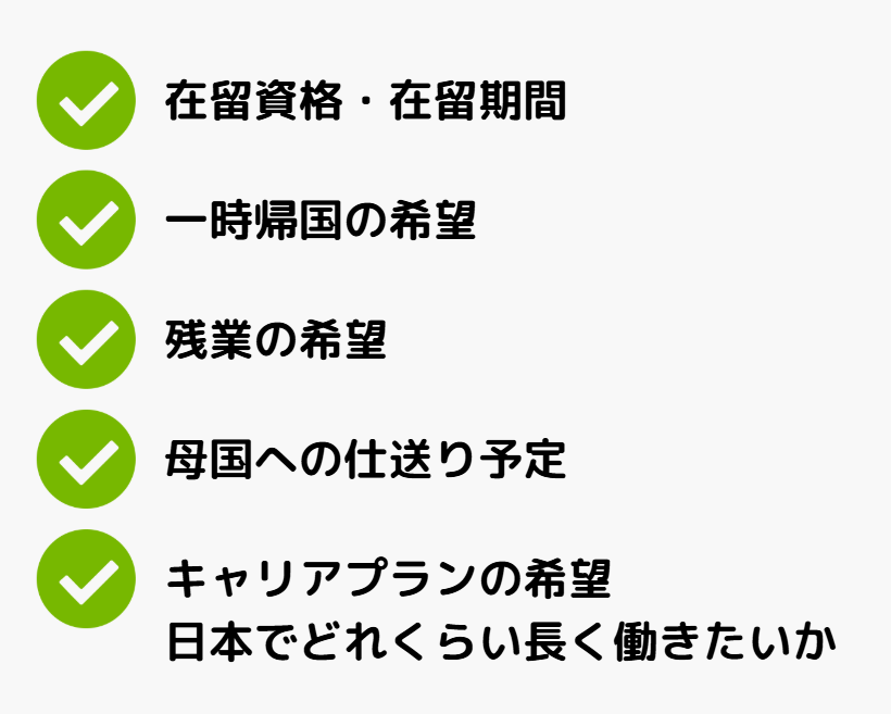 将来のキャリアプランをより具体的に聞いておくと、企業側が外国人に適切なサポートをしたり、研修計画を立てやすくなるでしょう。