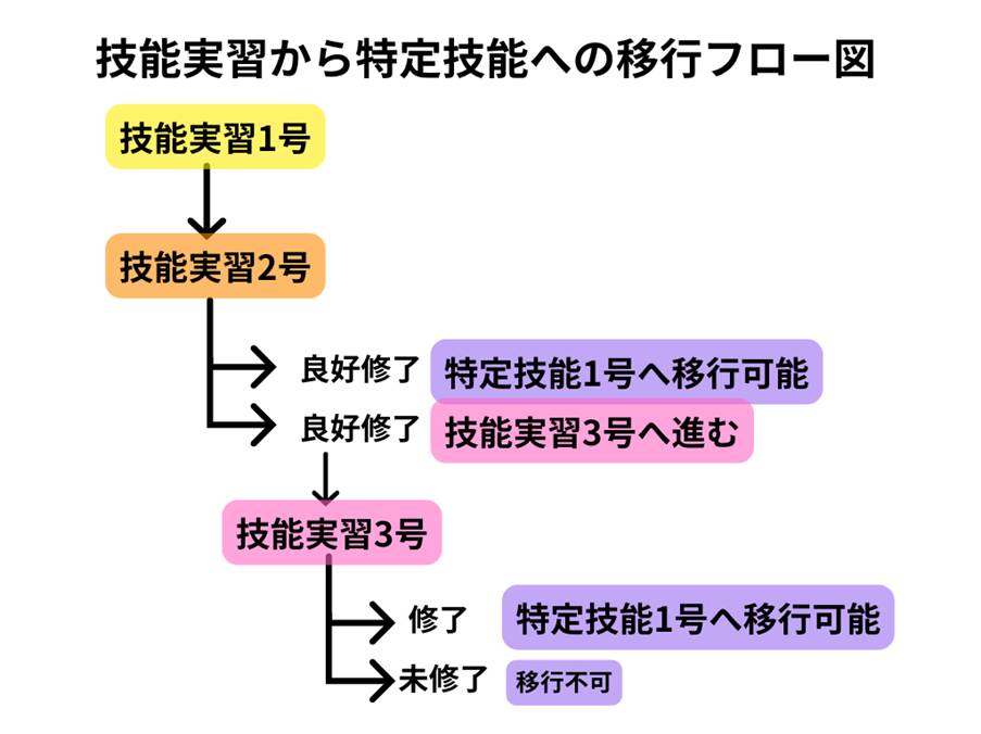 - 技能実習1号から特定技能への移行は不可