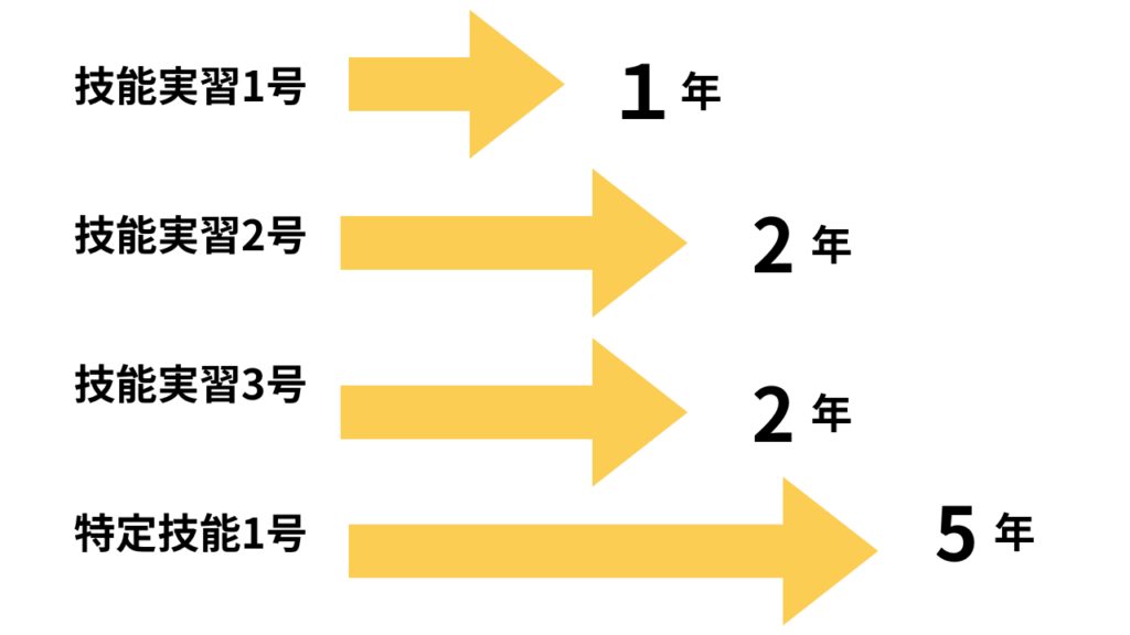 在留資格「技能実習」は、1号が1年、2号が2年、3号が2年の最長でも5年間しか採用できません。在留資格「特定技能1号」も、1年に1回、最大5回ビザを更新できます。