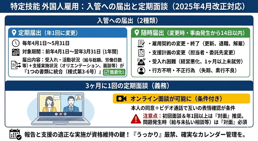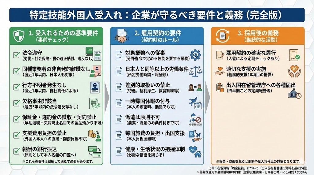 これらの要件は、採用時だけでなく、雇用期間中も継続して満たし続ける必要があります。定期的な報告義務や入管による調査もあります。