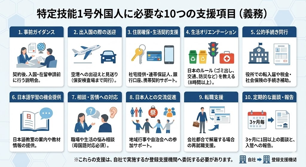 「2-3. 雇用契約の締結と支援計画の作成」で解説した通り、特定技能1号外国人には「入国前のガイダンス」から「生活オリエンテーション」、「定期的な面談」まで、計10項目の支援が義務付けられています。