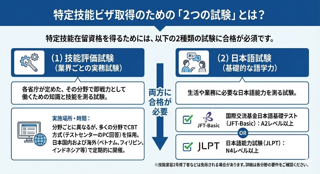 技能実習を経ていない外国人が在留資格「特定技能」を取得するためには、以下2つの試験に合格しなければなりません。
