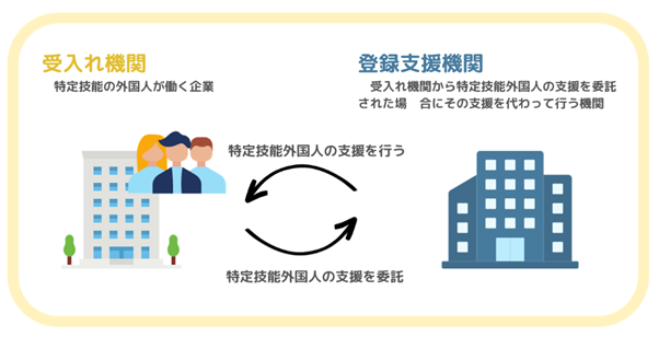 ​​「登録支援機関」とは特定技能外国人を雇用した時に、受入れ機関から委託され、その外国人の支援を代行する機関です。主な支援内容は「支援計画の作成」「義務的支援・任意的支援の実施」の2つです。​