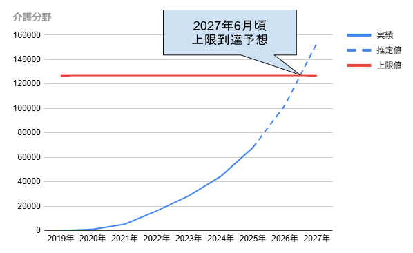 介護分野は、特定技能制度の中でも最大規模の受け入れが行われている分野の一つです。直近の1年間で増加人数がさらに加速しており、2027年半ばには受入上限に達する見込みとなっています。