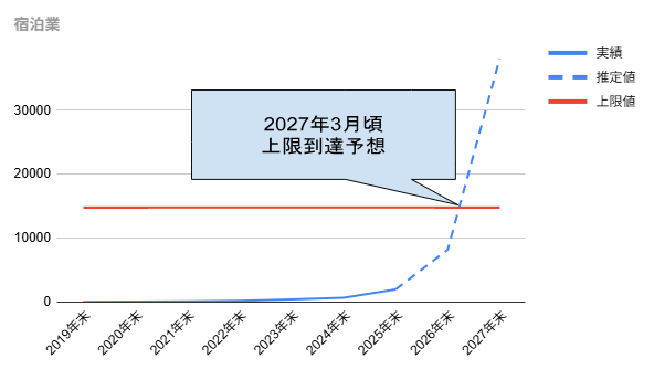 今回の調査の結果、外食業に続き「受入上限」に達するリスクが高い業種が浮き彫りになりました。直近の増加率から算出した、上限到達時期の予測ランキングは以下の通りです。