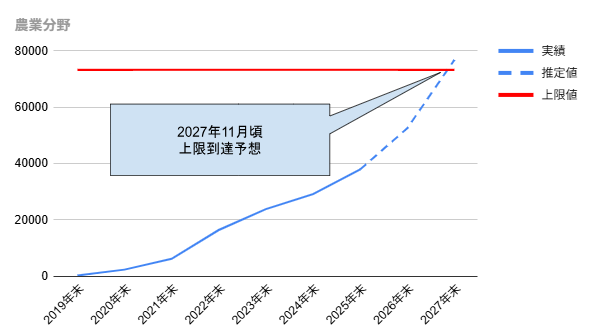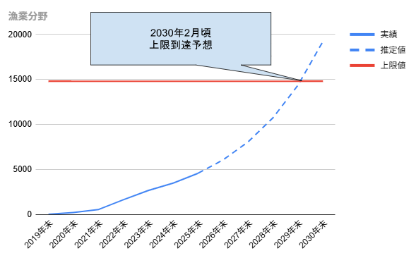 漁業分野は、増加の勢いはあるものの、上限設定に対して現在の充足率が低いため、2030年頃まで到達時期が分散される結果となりました。