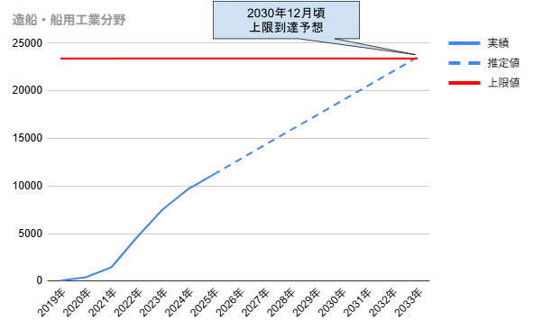 造船・舶用工業分野は、実数増加に基づいた推計を行っています。増加ペースは安定しており、2030年代初頭までは受入枠に十分な余力がある見通しです。