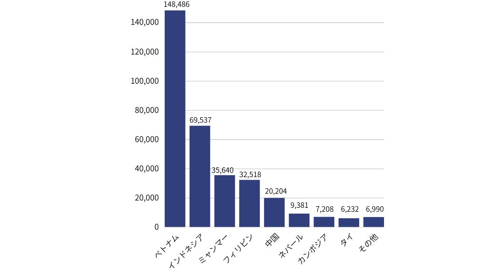 その他の国では、インドネシア(69,537人)、ミャンマー(35,640人)、フィリピン(32,518人)が多く、さらに中国、ネパール、カンボジア、タイなど、東南アジアと南アジアの国々がほとんどを占めています。