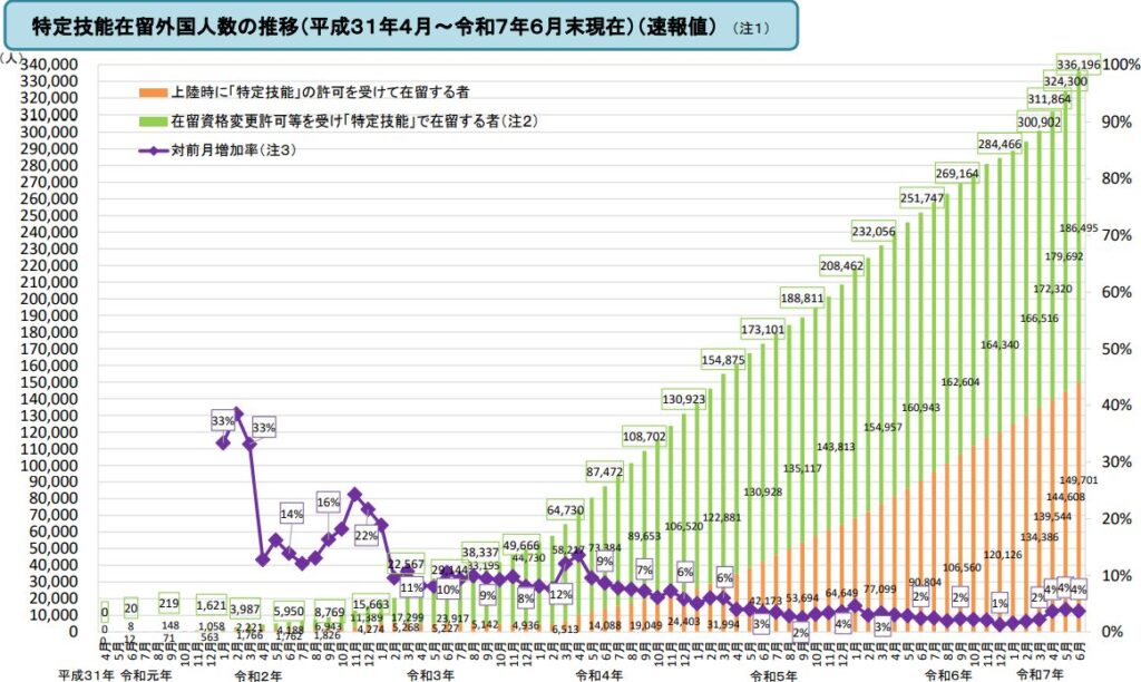 2025年6時点で特定技能外国人数は33万6196人で、過去最高人数を更新しています。